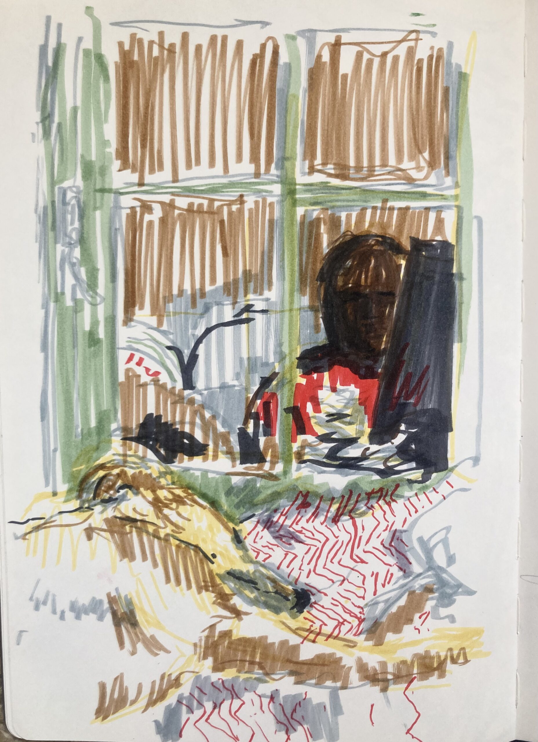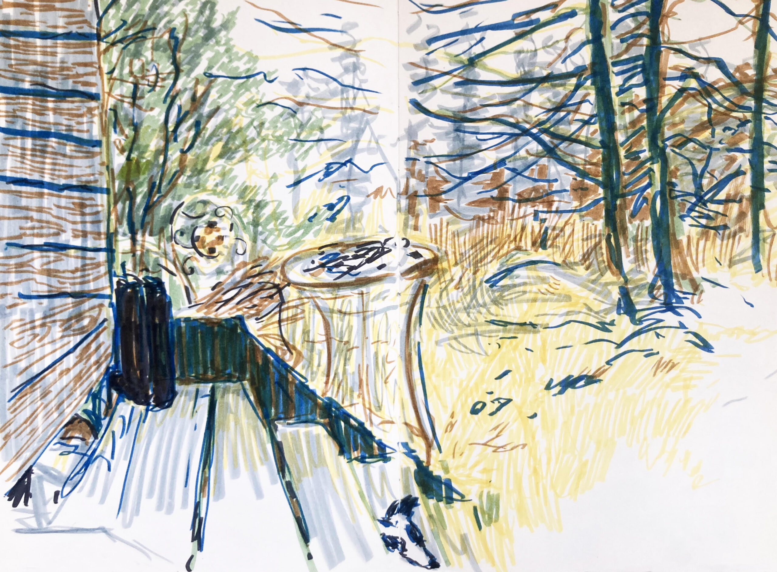 I spent a lot of time at the hut drawing, writing and reading and looking out of the high situated bed or the bench outside, feeling very lucky to have the space to be in nature and experience the rabbits and deer that would pop out of the woods now and again. Listening to the cacophony of toads, buzzards, nut-hatches and crickets. It felt like an extension of the studio, so you could fully immerse yourself in the experience, enhancing the time spent in the studio. There are beautiful walks in the area with a variety of natural settings on the doorstep, so choosing an activity dependent on your mood was very enjoyable and cathartic.”