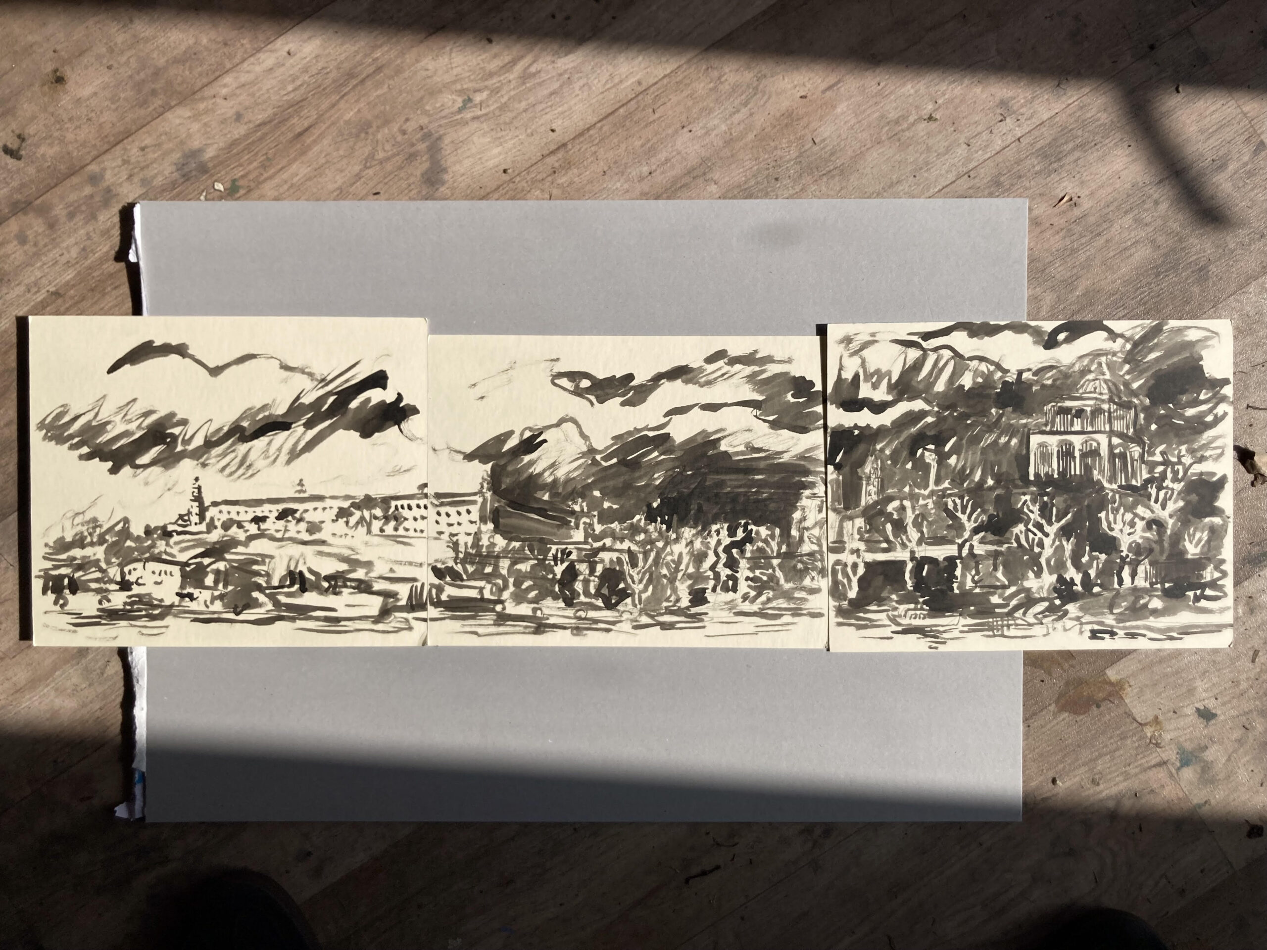 Prior to the residency I had just done a research trip to Istanbul where I made lots of drawings. I knew I wanted to make a project about a city on a river but I wasn’t sure where it was going. So on the residency I made lots of ink drawings on this theme. I did a bit of observational drawing on the residency but not so much. I preferred to use the time I wasn’t in the studio just walking. There was so much beautiful landscape right on your doorstep. “